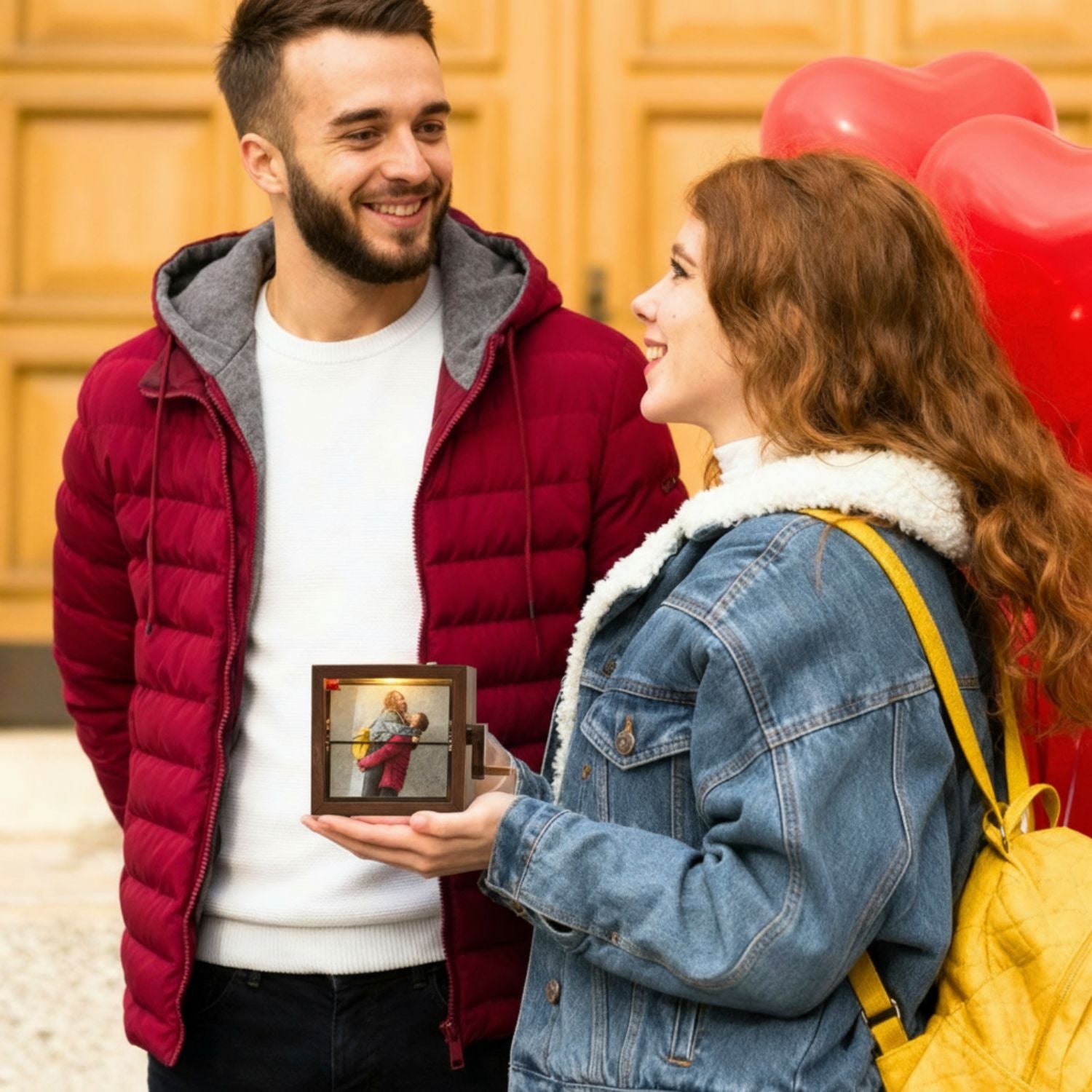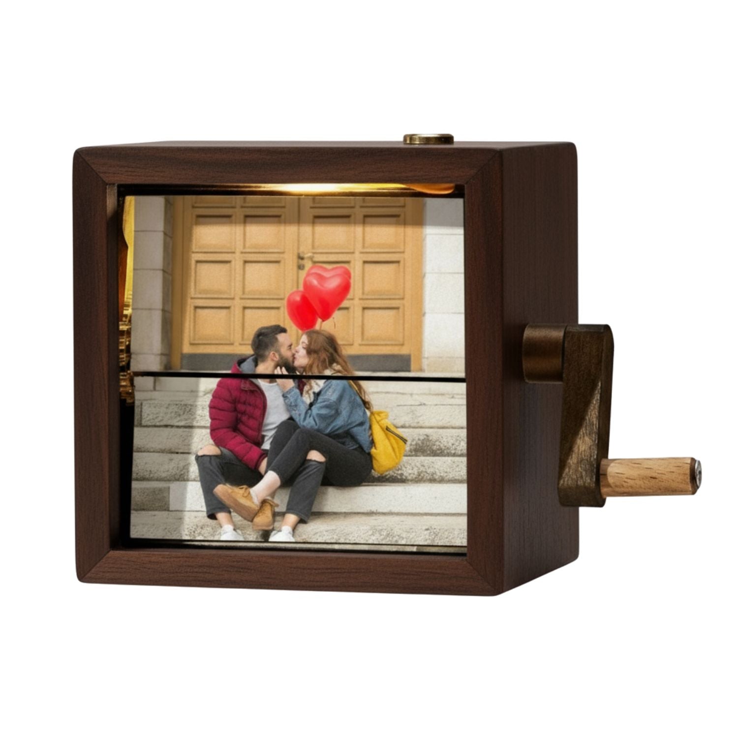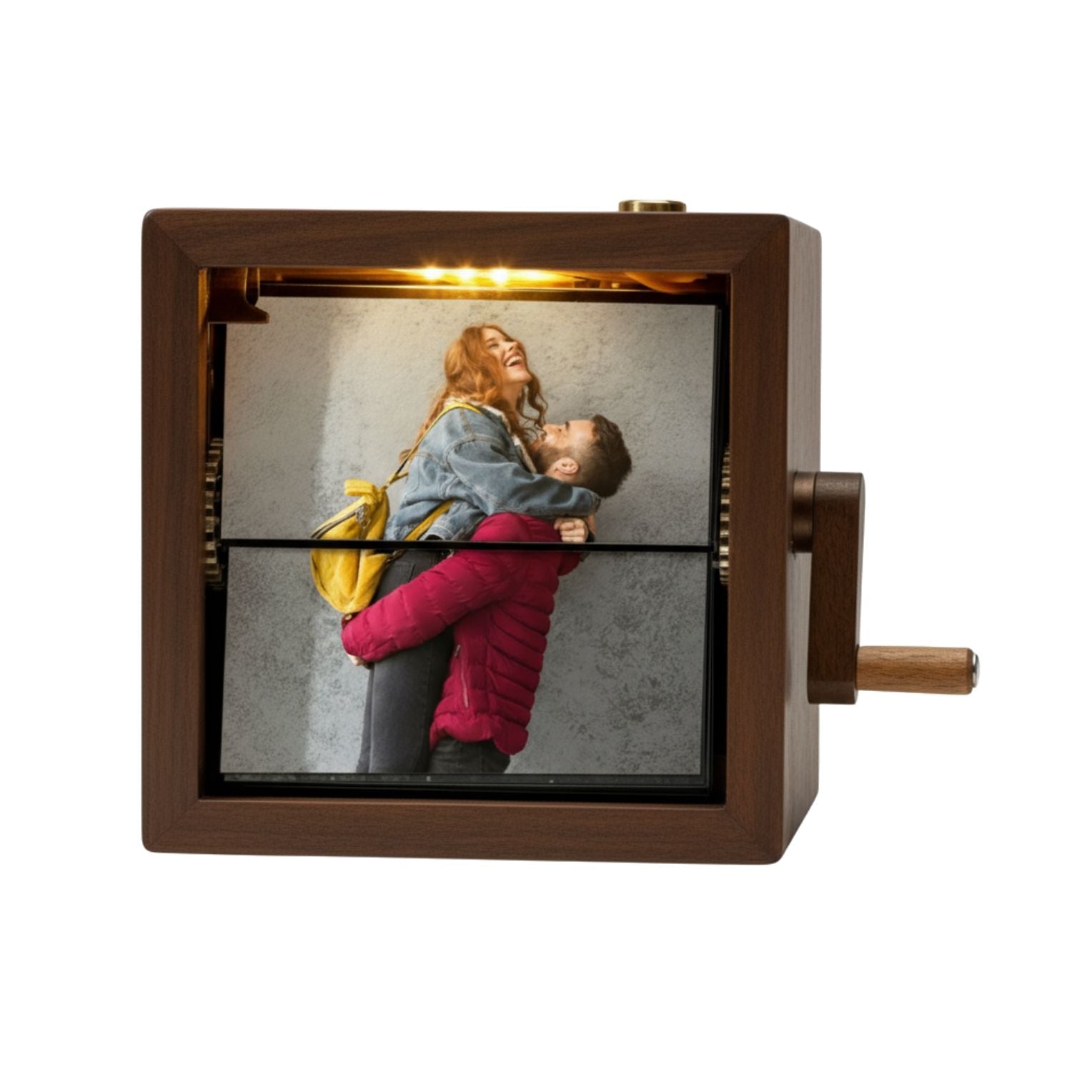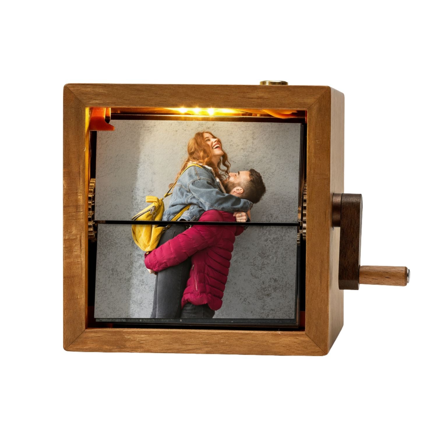 Este regalo original es perfecto para aniversarios, cumpleaños, bodas o fechas especiales, ya que combina la calidez de la madera con la tecnología de animación manual y una luz integrada que realza cada imagen.